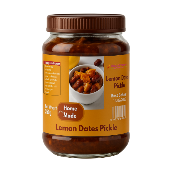 Experience the burst of flavors with our Lemon Dates Pickle, a unique Kerala specialty that combines the zesty sharpness of sun-ripened lemons with the natural sweetness of premium dates. Balanced with a medley of traditional spices, this pickle offers a mouthwatering mix of tangy, sweet, and mildly spicy notes.